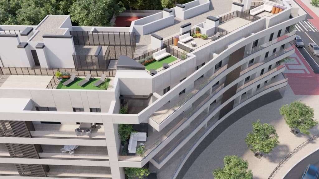 Edificio Residencial de 112 apartamentos con garaje y todos con amplias terrazas ubicado en la rotonda de La Menina de Alcobendas, Madrid.